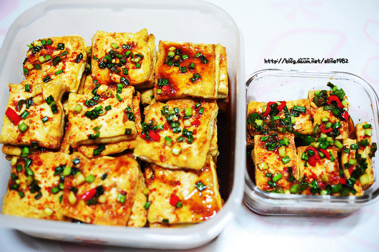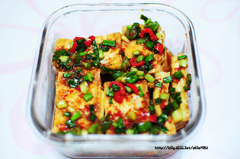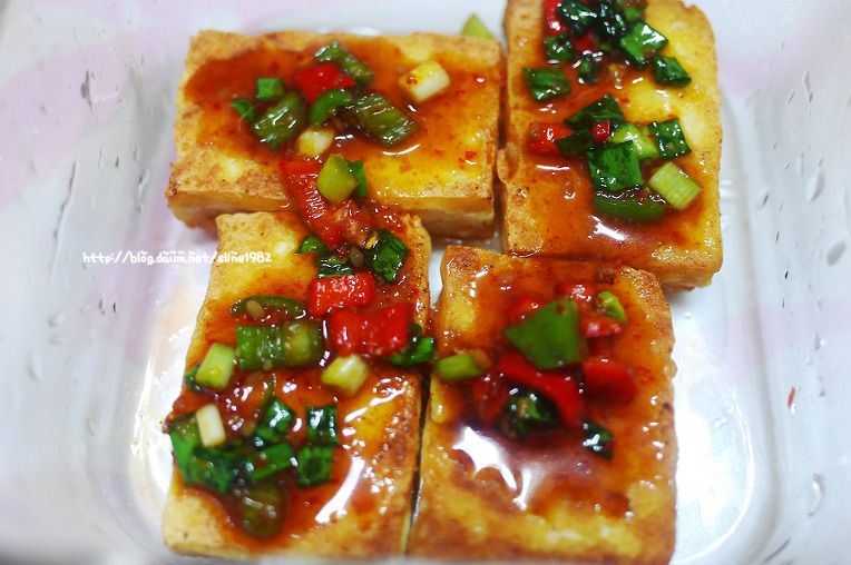 재료 : 두부 4팩 분량, 간잔 100ml. 설탕 3큰술, 물엿 2큰술, 고춧가루/깨소금 각 1큰술씩, 쪽파, 홍/청고추1개씩