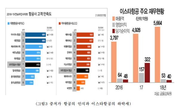 확인해 보면 2019년도 항공운송수입이 전기대비 3% 감소한 5,518억원을 기록하였으며, 당기순이익은 전기대비 2,376%감소한 -908억원 였다. 물론 이를 단편적으로 바라보았을때 갑작스러운 위기상황이라 인식할수 있다. 하지만 이스타항공의 이런 이익의 감소와 위기상황은 어제오늘 일이 아니며, 특히 이를 단순히 외부환경의 변화에 따른 위기로 인식하기엔 오류가 존재한다. 자료(그림3)만 살펴봐도 알수 있 듯 코로나사태 이전 중저가항공의 인식의 개선과 이용자수의 지속적 증가 등으로 산업전체는 성장했지만,이에 반해 이스타항공은 큰 성장세를 이루지 못했다는 점에 미루어 보아 내부적 문제점이 존재했다는 것을 알수 있다. 즉 이스타항공의 위기는 코로나라는 외부적 환경이 초래한 상황이라기 보다는 내부에 시스템 혹은 운영체계가 잘못되었슴에도 이를 인식하지 못하거나 개선이 이루어지지 않았음을 반증하는 것이다.