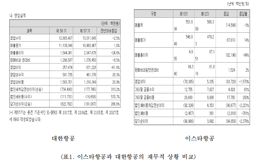 그렇다고 대형항공사라고 하여 이런 위기사항을 비켜나간것은 아니다. 대한항공의 경우 2019년 당기순손익은 6,228억원 손실을 기록하였으며, 항공운송수입은 전년대비 3.5% 감소 영업이익은 2,498억원으로 4,325억원 감소하였다. 즉 코로나에 따라 위기에 직면하고 있는 것은 이스타 항공만이 아니라는 것이다. 오히려 다량의 항공기와 직원들을 보유하고 있는 대형항공사들이 말로 그 존패에 따라 국가의 운영방식이나 정부의 정책, 경제자체가 흔들린다는 점에 미루어 그 책임감과 위기는 이스타항공보다 더 크게 실감하고 있다. 그럼에도 오히려 대한항공을 비롯한 대형 항공사들 그리고 이스타항공을 제외한 중저가 항공사들은 위기를 극복하고 성장세를 보이려 하는데 이들의 차이를 어떻게 설명할 것인가.