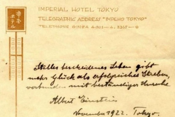 So on a piece of hotel stationery, Einstein wrote in German his theory of happiness: