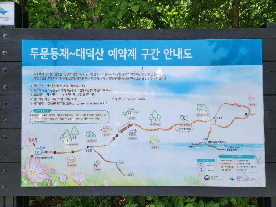 - 금대봉과 대덕산 산행은 초보들도 누구나 손쉽게 접할 수 있는 어렵지 않은 산행지이다. 강원도에 있는 산이고 해발 1,400미터 이상 되는 산이지만 난이도는 그리 어렵지 않다. 두문동재 해발 1,200 고지에서 시작을 하기에 정상까지 가는 코스는 상당히 유순하다. 두문동재에서 금대봉까지는 약 1km인데 거의 평지길이며 완만하게 오른다. 가는 동안 생소한 야생화를 쉼없이 볼 수 있다. 천상의 화원이란 말이 맞았다. 금대봉에 오르면 탁트힌 조망이 있다. 이후 조금 더 이동하면 더 멋진 조망터가 나온다. 금대봉에서 분주령까지도 야생화와 숲길이 계속 이어진다. 코스도 완만해서 어려움은 없다. 이후 분주령에서 대덕산 살짝 오르막이 있다. 대덕산에 오르면 조망이 참 좋다. 360도 조망을 볼 수 있으며 주변에 있는 함백산과 매봉산,금대봉등을 볼 수 있다. 하산로도 완만해서 어려움이 없다. 하산 끝엔 한강의 발원지인 검룡소가 있다. 검룡소를 보고 계곡 따라 이동하면 산행을 마치게 된다. 쉬운 산행지이며 누구나 접할 수 있는 산행지이다. 더불어 사전예약은 필수이다.