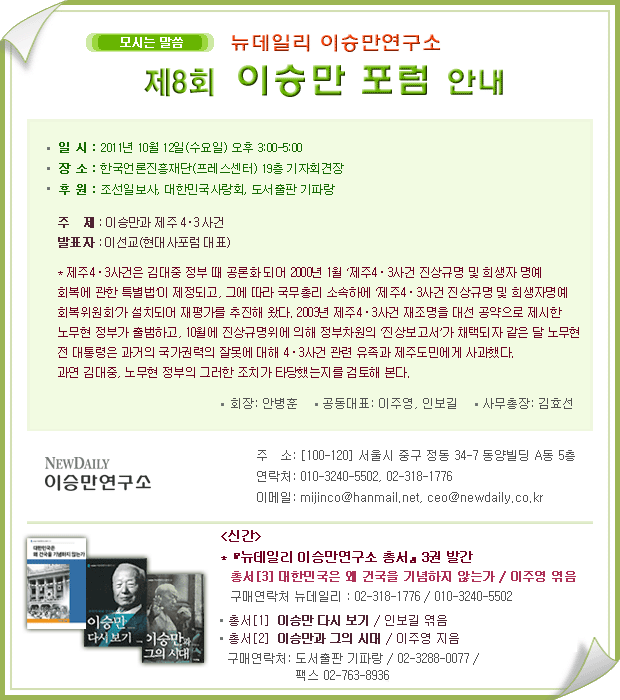 뉴데일리 이승만연구소 제8회 이승만포럼 안내 작성자알리미|작성시간11.10.10|조회수12 목록 댓글 0 글자크기 작게가 글자크기 크게가 다음검색 현재 게시글 추가 기능 열기 북마크 공유하기 신고 센터로 신고 댓글 댓글 0 댓글쓰기 답글쓰기 댓글 리스트