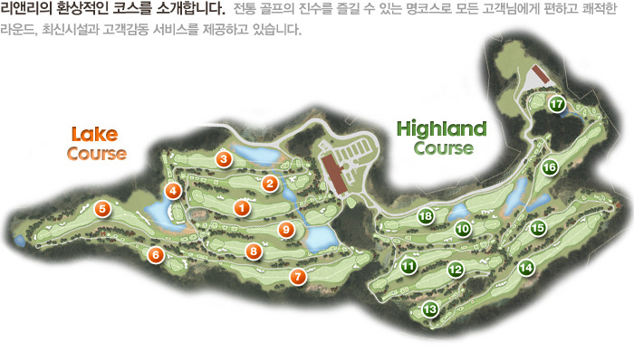 레이크(호수)와 하이랜드(암반)로 구성됐으며, 대중제 골프장임에도