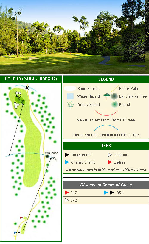 13번홀(파4)이 특히 인상적이다.이 골프장은 파72, 19홀로 독특하게 설계됐다. 마지막 19번홀(파3)은
