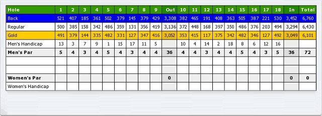 Regular Tee(6,430yard), Gold Tee(6,101yard)로 되어 있는 비교적 짧은 길이