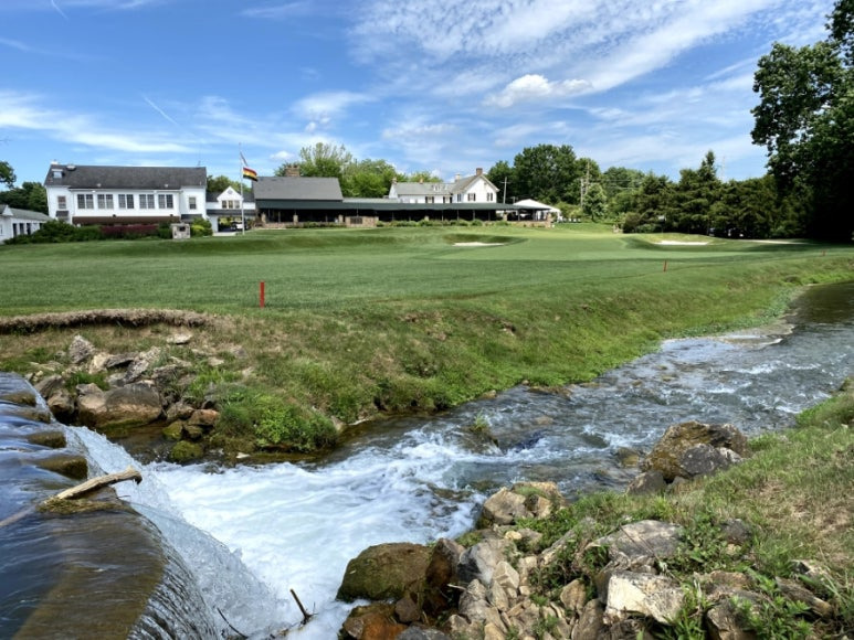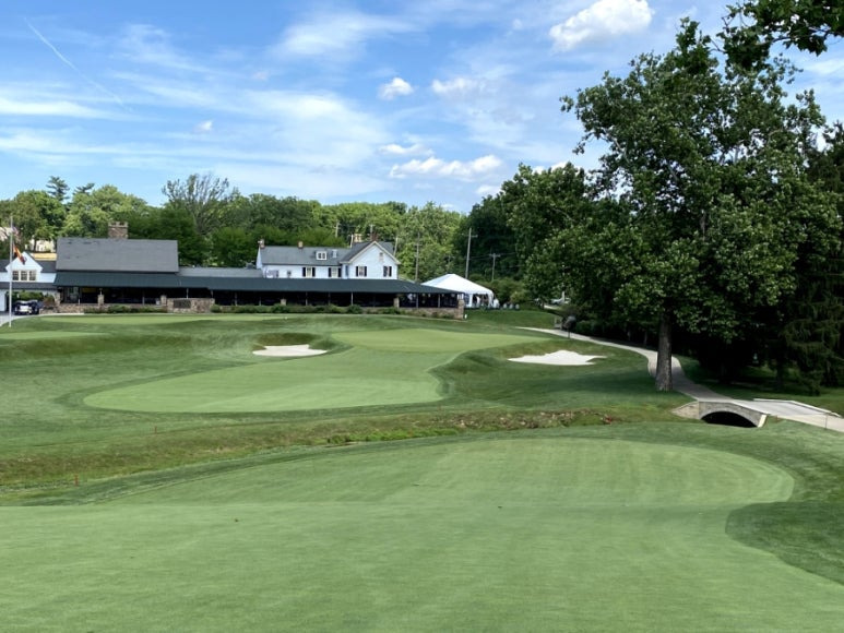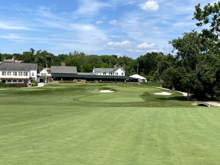 16번 홀, 215야드, 파 3: 약간 내리막으로, 앞쪽은 작은 개울로 둘러싸인 그린으로 필라델피아 크리켓 클럽 골프 디렉터 짐 스미스 주니어에 따르면, 이곳의 퍼팅 표면은 "어디에서도 플랫 퍼팅을 할 수 없으며, 특히 1.5미터 이내에서는 더욱 그리해야 좋은 스코어를 챙길수있다고 한다.