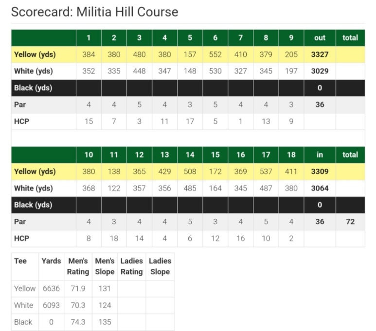 이곳 밀리티아 골프 코스가 조성된 지역은 미국 독립 전쟁 중에 펜실베이니아 민병대가 밸리 포그(Valley Forge)에 있는 전설적인 야영지로 이동하기전 점령했던 곳으로 위사히콘 코스와 마찬가지로 기차 선로가 코스 중앙을 가로 지른다. 또한 코스보다 먼저 지어져있는 터널을 2회이상 통과해야 한다. 이 코스 역시 20세기초에 이곳 필라델피안 크리켓 클럽 수석 코치로서 세계 골프 명에의 전당 회원인 윌리 앤더슨(Willie Andersson-18770-1919)에게 헌정되었다.