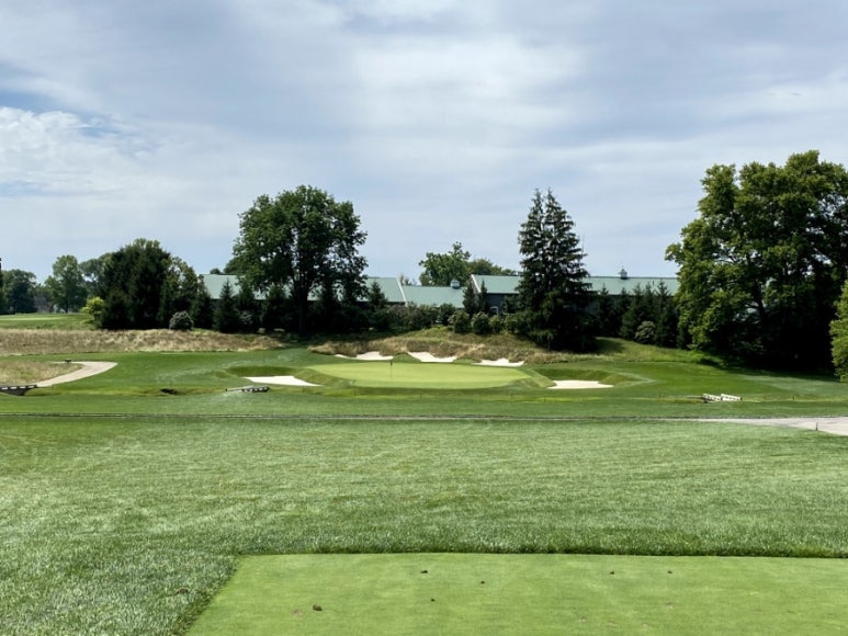 맞닿아 있는 파4 13번 홀의 그린사이드 벙커, 두 개의 긴 파4(4번 홀과 17번 홀)