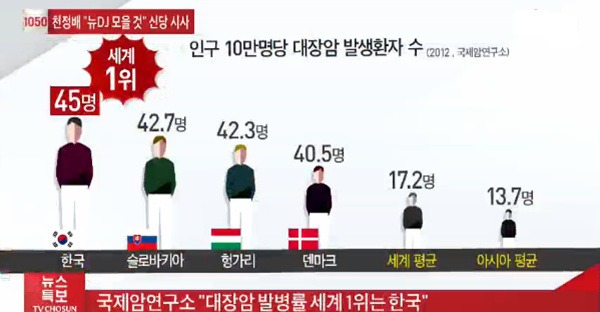우리나라의 대장암 발병률은 10만명당 45명으로 전 세계 1위를 달리고 있습니다. 그만큼 과거 50대 이상의 장년층에게만 찾아오는 질병이었는데 현재는 서구화된 잘못된 식습관과 스트레스로 인하여 젊은 층의 대장암 발병률이 증가하고 있습니다.