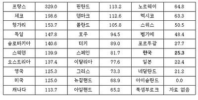 ▲ 2008년 기준 OECD 국가별 곡물 자급률 자료