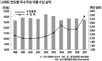 우리나라의 곡물자급률은 사료용을 포함해 약 25%로, OECD 가입 30개국 가운데 27위에 해당하는 수치. 이는 지금까지의 수치 중 최저치이며, 하루 세 끼 중, 두 끼 이상을 외국에 의존하고 있다고 해석할 수 있습니다. 앞으로 농산물 시장개방이 확대되면 식량자급률은 하락할 것으로 보이니 더욱 슬픈 현실입니다.