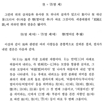 따라서 地지를 풀이하면 다음과 같다. "阜(언덕 부)의 호환자인 土(흙 토)와 匕(바뀔 화)의 변형자인 他(다를 타)의 생략형 也로 이루어져, 언덕[阜→土]이 무너져내려 변한[바뀐: 也] 땅을 표현한 글자이다." 다음은 졸고『韓國에서 발견된 甲骨文字에 관한 연구』(2002)에 실린 地 관련 부분이다.