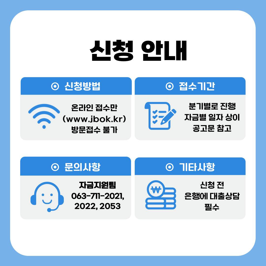 | 전북특별자치도 중소기업 이차보전 자금지원 ㆍ시설투자금 및 운전자금 이차보전 ㆍ신청기간 : 경영안정자금 7/14(월) ~ 7/18(금), 벤처기업육성자금 7/21(월) ~ 7/25(금) |