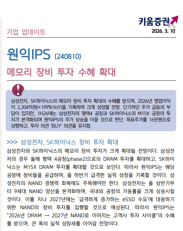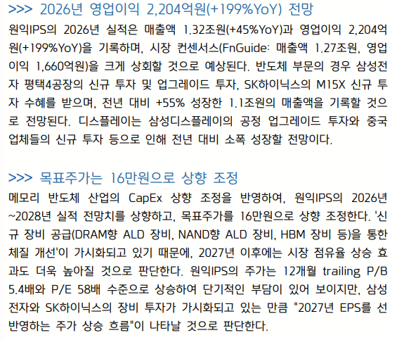 2) 단기적인 주가 급등의 부담이 있지만, 1H26에는 삼성전자의 평택4 공장과 SK하이닉스의 M15X 공장의 투자가 본격화되며 원익IPS의 주가 상승을 이끌 것으로 판단