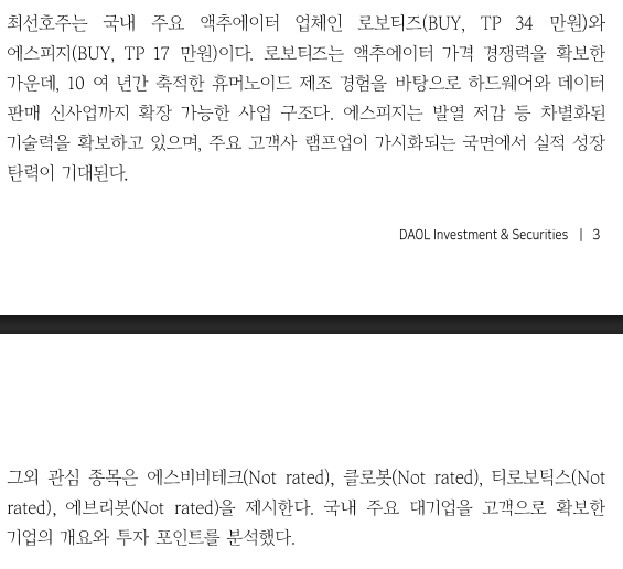 - 로보티즈 최선호주(TP 34만원), 에스피지 차선호주(TP 17만원)