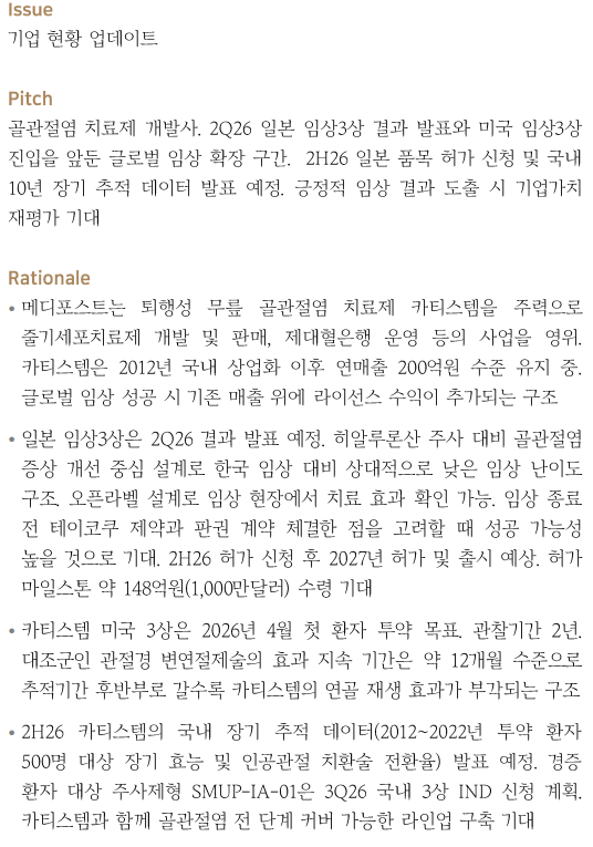 ▶️ 2H26 국내 10년 장기 추적 데이터 발표를 통해 카티스템의 장기 효능 및 치료 지속성 확인 기대. SMUP-IA-01은 3Q26 3상 진입 예정으로, 중증(카티스템)에서 경증(주사제형)으로 이어지는 골관절염 전 단계 커버 라인업 확장 기대