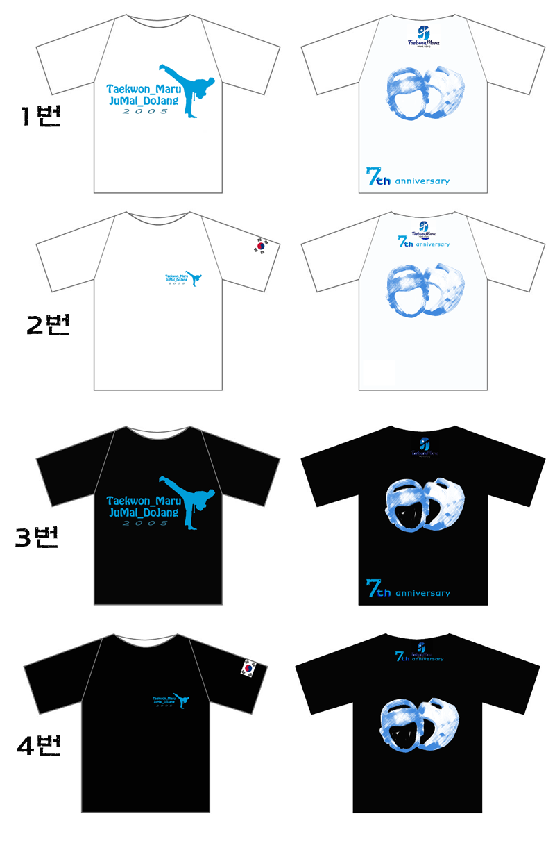 티셔츠도안 최종입니다!! 4/17(목)까지 의견받습니다!! 작성자권태연|작성시간12.05.06|조회수471 목록 댓글 21 글자크기 작게가 글자크기 크게가 색상은 흰색과 검은색 두 가지로 제작합니다!! 디자인을 선별해 주시면 두 가지로 축약하여 제작하도록 하겠습니다! 받으실 땐 원하시는 색상의 디자인의 티셔츠 한장을 받게 되십니다!! 다음검색 현재 게시글 추가 기능 열기 북마크 신고 센터로 신고 댓글 댓글 21 댓글쓰기 답글쓰기 댓글 리스트 답댓글 작성자권태연 작성자 본인 여부 작성자 | 작성시간 12.05.08 또 뽀샵질을ㅋㅋㅋㅋ 통일하겠습니다!!!ㅎㅎ 작성자박영민1 | 작성시간 12.05.07 2번이용~~^^ 작성자박영태 | 작성시간 12.05.07 2번요~! ^^ 작성자이사범 | 작성시간 12.05.08 2번이요^.^ 작성자권설아 | 작성시간 12.05.08 4번이요ㅋ 아~언제 태권마루나가지ㅠ 댓글 전체보기