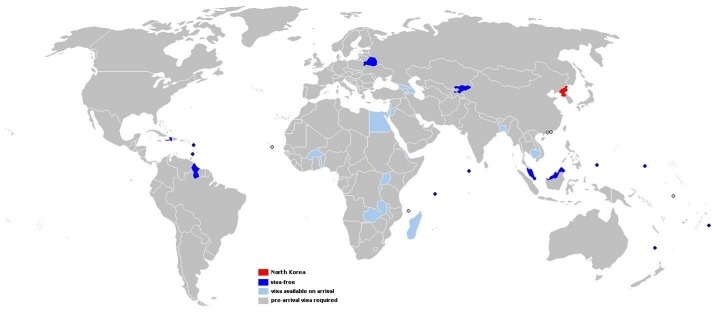 그밖에 말레이시아, 브루나이,가이아나, 벨로루시 정도의 나라는 형식적으로나마 무비자로 존재하고 있는 부분도 있습니다.