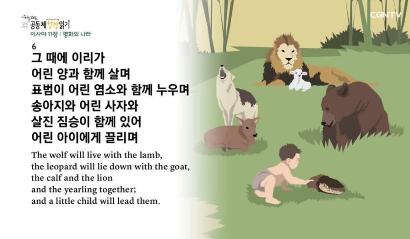 우리 세상의 모습들이 이런 모습으로 가득 찬다면 얼마나 좋을까하는 생각이 들었습니다. 아마도 천국의 모습을 상상하며 이사야서를 집필한 것이 아닐까 생각이 들었습니다.