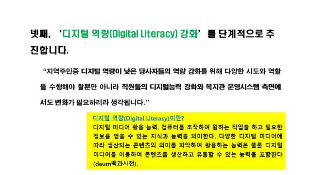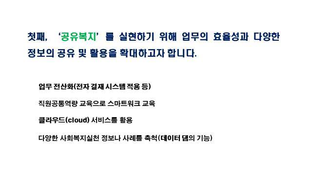 (연관 key words : 공유복지, 스마트워크, 디지털역량확보, 데이터댐, 업무전산화, 클라우드, 개인정보보호 강화, 복지경영시스템 등)