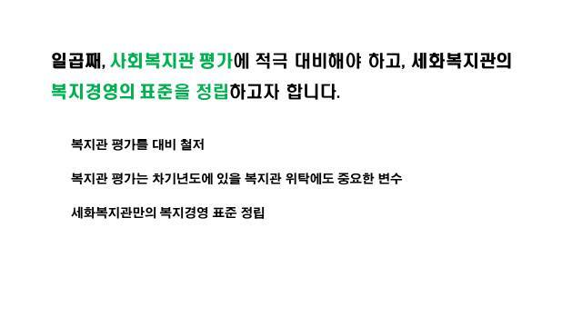 2022년은 세화복지관이 코로나19에 대응했던 노하우(know-how)와 함께 사회복지 트렌드(trend)를 잘 읽어 변화의 방향성을 찾고 적시성(timeliness)을 가지고 또 다른 도전이 시작되는 한 해가 되어야 할 것입니다. 세화복지관 직원 모두가 우리가 풀어야 할 과제라는 생각과 도전하는 자세로서 더욱 쇄신하고 도약하고자 함께 노력한다면 좋은 성과를 창출해 낼 수 있으리라 확신합니다.