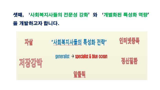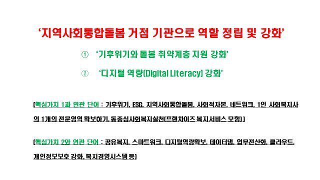 (연관 key words : 기후위기, ESG, 지역사회통합돌봄, 사회적자본, 네트워크, 1인 사회복지사의 1개의 전문영역 확보하기, 동중심사회복지실천(프랜차이즈 복지서비스 모형) 등)