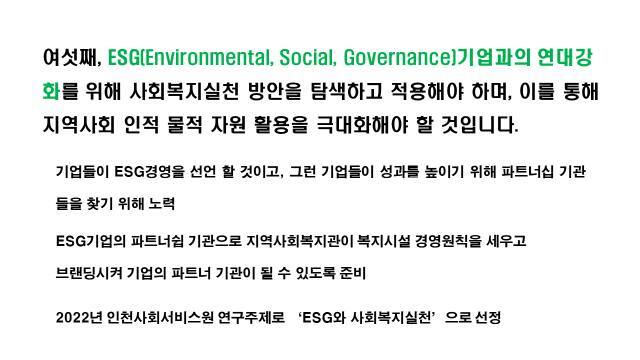 그러나 코로나19가 여전히 우리의 생활 속에서 사라지지 않는 상황 속에서 “with COVIDE”의 관점을 가지고 사회복지실천의 다각화를 지속적으로 시도해야 한다는 점은 잊지 말아야 하며, 정부의 사회복지정책의 변화(커뮤니티 케어, 사회서비스원의 역할 확대, 한국판 뉴딜2.0정책의 점진적 확대 등)와 함께 기업의 ESG 경영 확대, 사회복지관 평가 등도 함께 고려해 가면서 구체적인 기관 운영 방향을 찾아 나가야 할 것입니다.