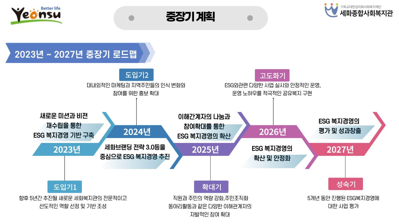 세화종합사회복지관이 2023년 재위탁을 받고 추진하고 있는 ESG 복지경영 로드맵 단계에서 2025년에는 추진 3단계인 확대기로 지역주민들과 함께 가치 실천을 위해 노력하고 활동하는 시기로 ESG 가치를 지역에 확산하기 위한 사업과 운동적 활동을 하는 실천을 말합니다.