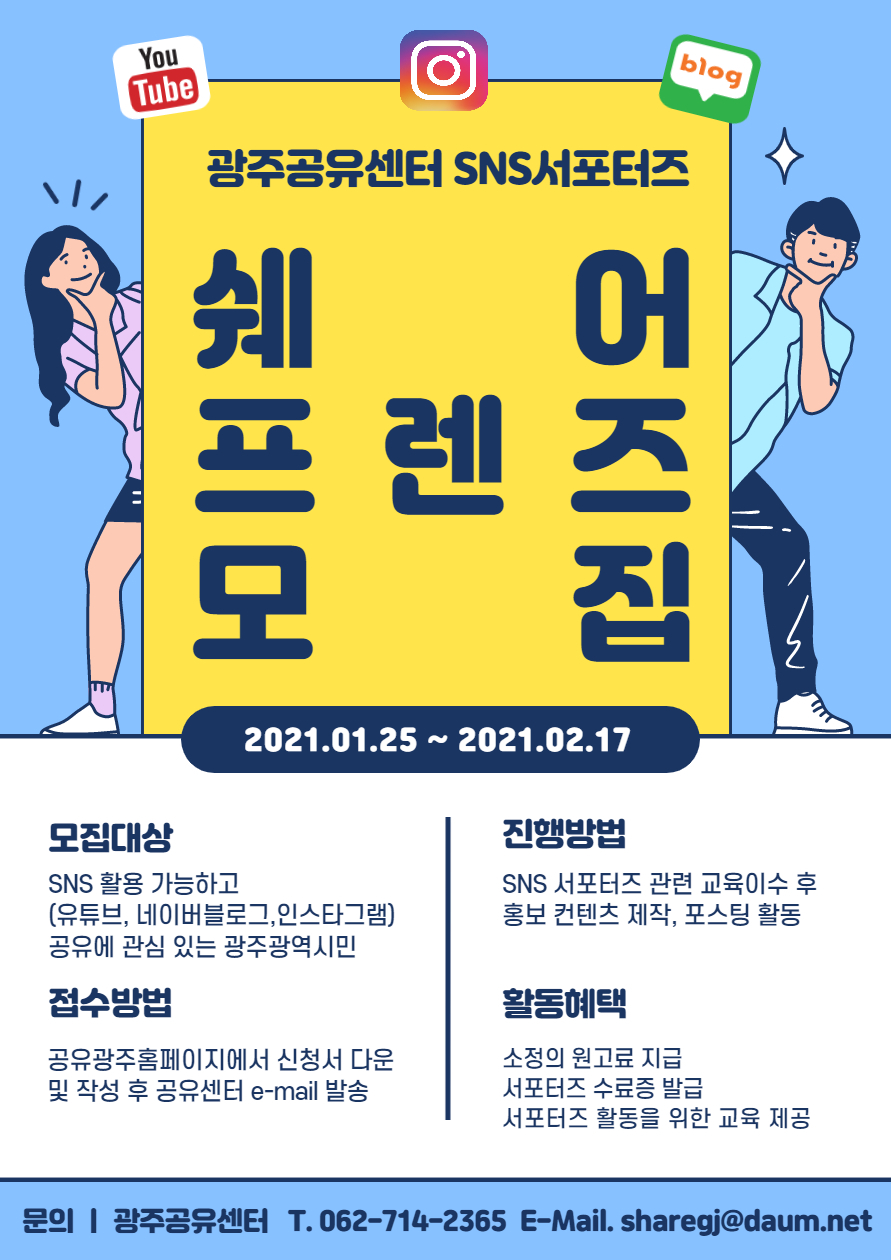 | 광주공유센터에서 sns서포터즈를 모집하오니 많은 관심과 참여 부탁드립니다. 모집기간 : 01.25 ~ 02.17 (17:00 도착분까지) 모집인원 : 00명 모집대상 : sns 활용 가능하고(유튜브, 네이버블로그, 인스타그램) 공유에 관심 있는 광주광역시민 접수방법 : 공유광주홈페이지(http://sharegj.kr/app/board/view?md_id=notice&code=2043&page=1) 접속 후 공지사항 - 서포터즈 모집공고에서 신청서 다운 및 작성 후 공유센터 이메일 발송 (sharegj@daum.net) 활동혜택 : 소정의 활동비, 서포터즈 수료증, 활동 교육 제공 |