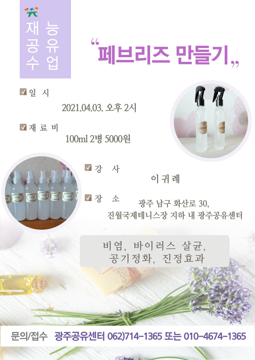 | 어른, 아이 누구나 참여 가능한 내가 직접 만드는 페브리즈~~ 광주공유센터에서 페브리즈 만들기 수업을 진행합니다. 비염, 바이러스 살균, 공기정화, 진정효과가 있는 천연 페브리즈 만들기 입니다. 관심이 있는 분들은 광주공유센터 062) 714-1365로 연락하여 접수 바랍니다. |
