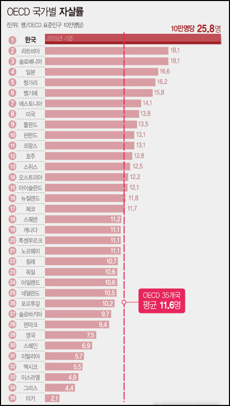 우리나라의 자살률은 10만 명당 25.8명으로 압도적 1위다. OECD 35개국 평균이 11.6명인데 그 두 배가 넘는다. 자살률이 제일 낮은 터키에 비하면 무려 23배에 달한다. 2위와도 엄청난 차이가 난다. 자살률은 지금 한국 사회의 민낯을 드러내는 부끄러운 수치다. 한 해에 자살로 죽는 사람이 1만 명이 훨씬 넘는다.