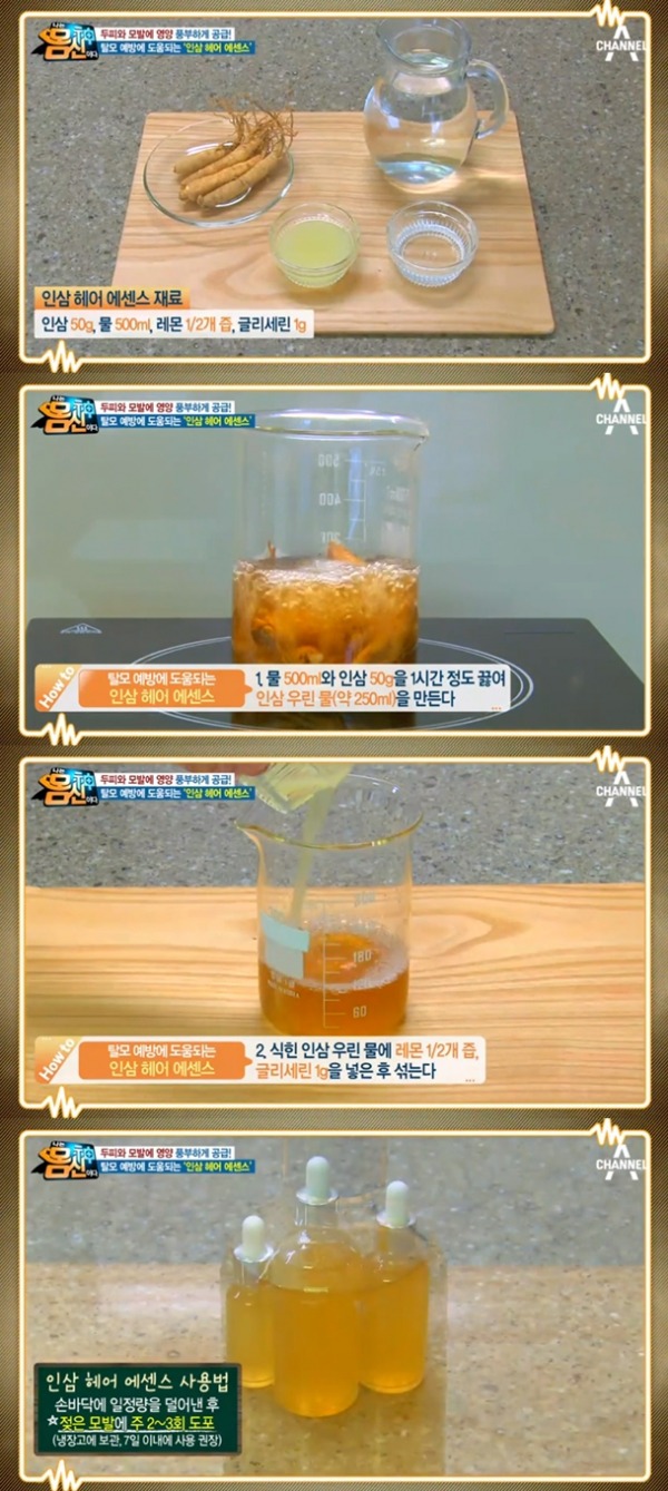 방송에서는 탈모 예방에 도움이 되는 인삼 헤어 에센스를 만드는법을 공개했다.