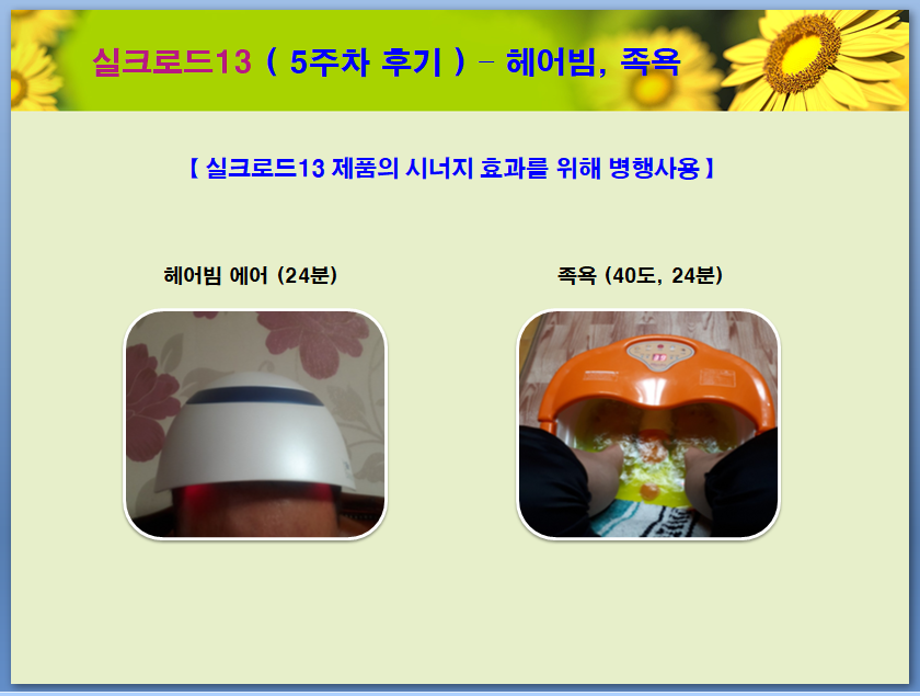 실크로드13 제품 복용 시 시너지 효과를 좀 더 높이기 위해서 헤어빔 에어와 족욕으로 계속
