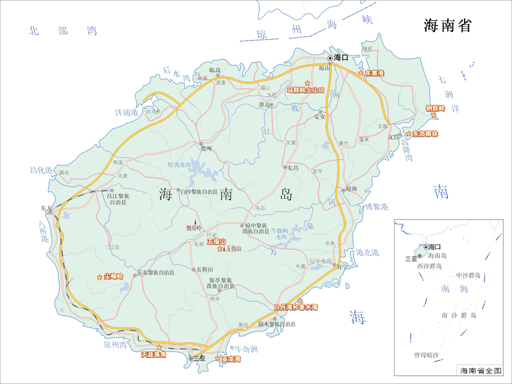 중국대륙의 남단, 海南島와 西沙/中沙/南沙군도의 섬들과 해역을 포함하는 지역이며, 북으로는 廣東省에 접하고 있고, 서쪽으로 동킹만(北部灣)과 베트남에 인접해 있으며, 동남쪽과 남쪽으로 필리핀, 브루네이, 말레이시아와 마주보고 있음.