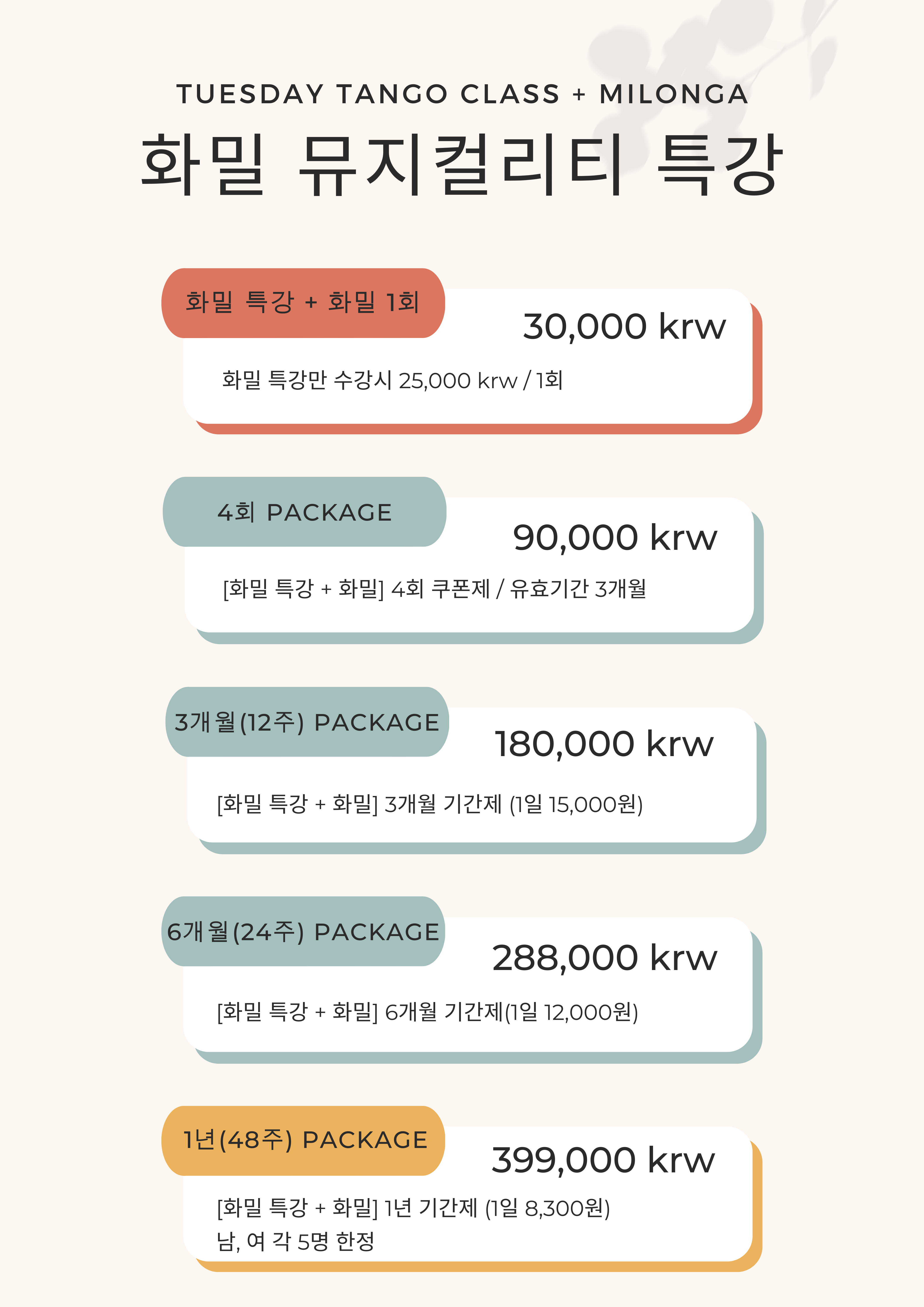 1년 화밀 특강 패키지를 구입하시면 1년 내내 화요일에 맛난 음식과 술, 밀롱가, 뮤지컬리티 수업을 1일 8,300원에 즐기실 수 있습니다.