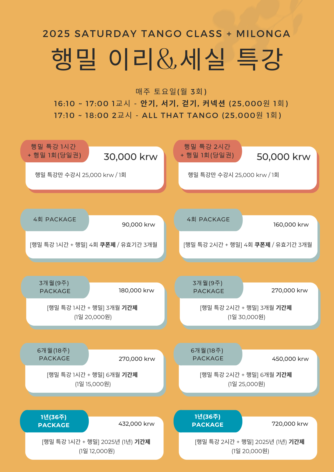 1년권으로 참여하시는 분들은 밀롱가비만으로 행밀 특강 1시간이 포함되는 파격적인 혜택이 있으니 많이 참가해 주세요!