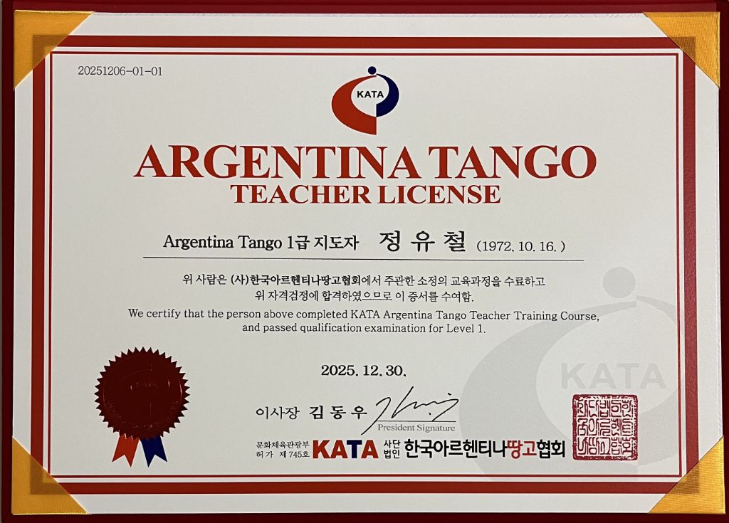 사단법인 한국아르헨티나땅고협회 KATA 아르헨티나 탱고 1급 지도자 자격증 수여식 있었습니다.
