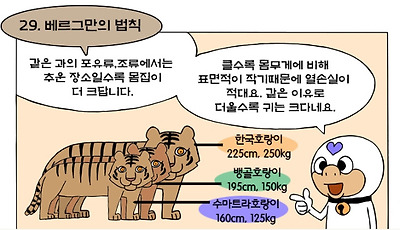 베르그만의 법칙 [Bergmann's Rule] : 체온을 일정하게 유지하는 항온동물은 같은 종일 경우 추운 곳에 살수록 일반적으로 몸의 크기가 크다는 법칙이다. 19세기 독일의 생물학자 베르그만(Karl Georg Lucas Christian Bergmann, 1814~1865)이 주창했다. ![]() 항온동물은 에너지를 사용하여 체온을 일정하게 유지한다. 추운 곳에 사는 항온동물일수록 체온을 유지하기 위해서는 주변으로 발산되는 몸의 열을 최소화하는 것이 필요하다. 반대로 더운 곳에 사는 항온동물의 경우 물질대사 활동에 의해 발생하는 열을 주변으로 발산해야 한다. 열의 발산은 몸의 표면에서 일어나는데 몸의 표면적이 좁을수록 발산하는 열의 양이 줄어든다. 몸의 크기가 커지면 몸의 총 표면적은 늘어나지만, 몸의 부피에 대한 표면적은 줄어든다. 수치로 계산해보면, 몸의 가로, 세로, 높이의 길이가 두 배가 될 때 부피는 8배로 늘어나는 반면, 표면적은 4배로 증가한다. 따라서 추운 지방에 사는 항온동물은 몸의 크기가 클수록 체온유지에 유리하고, 더운 지방에 사는 항온동물은 작을수록 유리하다. (출처 : 네이버 백과사전 & 양영순의 '학습마나') 불곰 (Ursus arctos laciotus) 식육목 곰과에 속하는 동물. 알래스카 코디액섬에 서식하는 알래스카불곰(코디액불곰) U.a.middendorffj는 몸길이 2.8m, 몸무게 700㎏ 이상이 되나, 유럽불곰 U.a.arctos는 200㎏ 미만이다. 이것은 북쪽에 서식하는 것일수록 몸이 커진다고 하는 베르크만 규칙에 들어맞는 예이다. 털은 주로 갈색이지만 적갈색·흑색인 것도 있다. 불곰의 분류에는 불곰을 1종으로 하고 그 밖의 것은 모두 이것의 아종으로 하는 것, 알래스카불곰과 회색곰을 독립시켜 1속 3종으로 하는 것, 회색곰만을 독립시켜 1속 2종으로 하는 것 등이 있다. 어릴 때는 나무타기를 잘 하지만, 자라면 그다지 능하지 않다. 땅 속에 판 구멍이나 나무의 빈 구멍 속에서 월동한다. 암컷은 겨울잠을 자는 기간인 12∼1월에 한두 마리의 새끼를 낳는다. 주로 나무열매나 벌 등을 먹는데, 연어 등의 어류도 즐겨 먹는 잡식성이다. 유럽에서 시베리아, 나아가 베링해를 넘어 북아메리카까지 널리 분포한다.