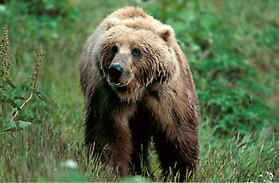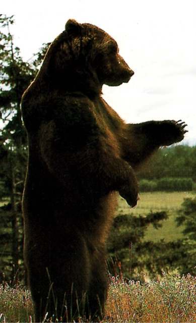 회색곰 (灰色- Ursus arctos horribilis) 식육목 곰과 포유동물. 몸높이 90∼105㎝, 몸길이 180∼240㎝, 몸무게 160∼500㎏이고 갈색곰의 한 아종이다. 몸빛깔은 황갈색 또는 암갈색인데 털끝이 흰 빛을 띠어 서리가 내린 듯이 보인다. 머리가 비교적 크고 이마가 높으며 어깨 부분이 높게 솟아 있다. 헤엄을 잘 치며, 다른 곰에 비해 나무타기를 못하지만 어린 곰은 잘 오른다. 야행성이나 낮에도 활동하며 행동권이 넓다. 잡식성으로, 나무열매·풀 외에 곤충류·파충류·물고기·사슴 등을 잡아먹는다. 4∼5살이 되면 성숙하며 번식력이 낮아 2∼3년 마다 2마리 정도의 새끼를 낳는다. 산악지대의 삼림에 서식하며 주로 알래스카에서 캘리포니아 일대 및 로키산맥에 걸쳐 분포한다.