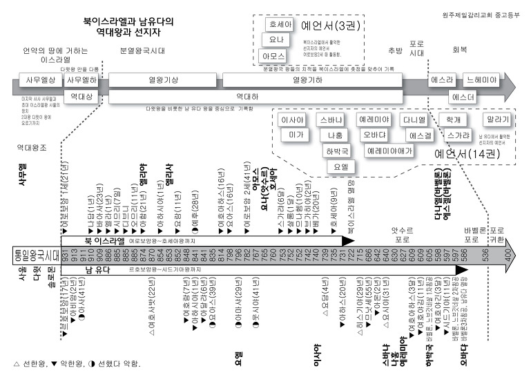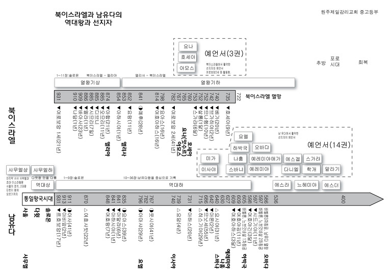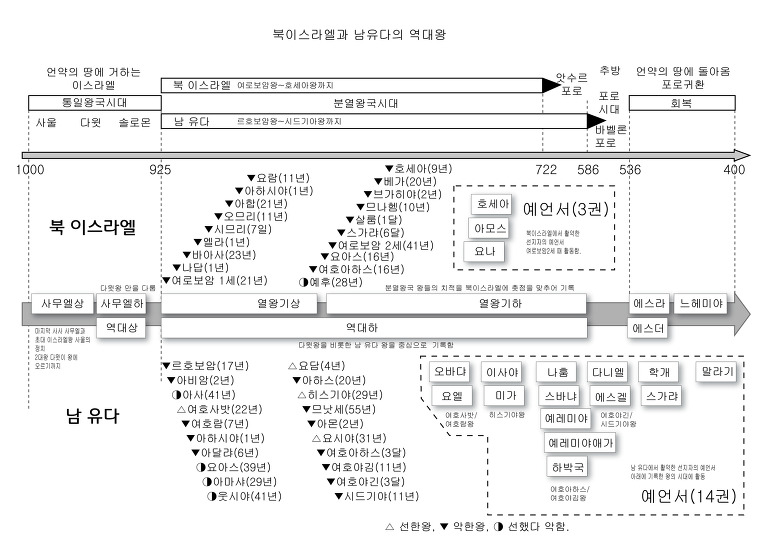 왕 이름 옆에 굵은 글씨가 그 시대에 활약한 선지자입니다.