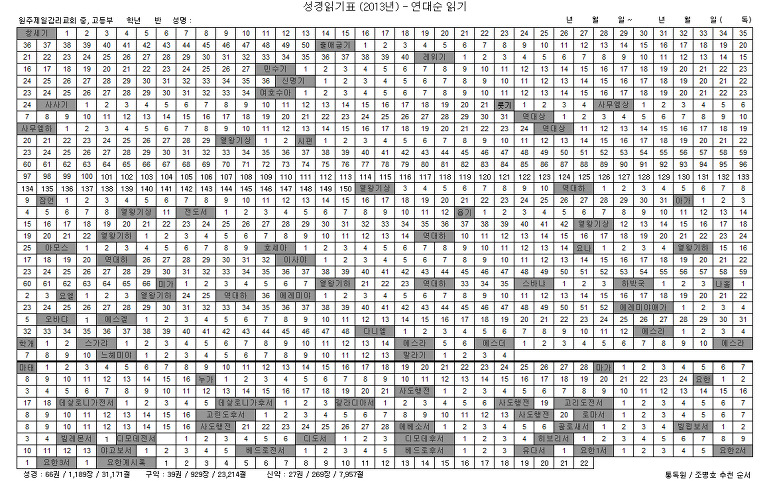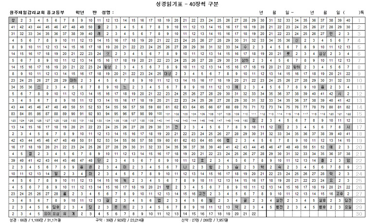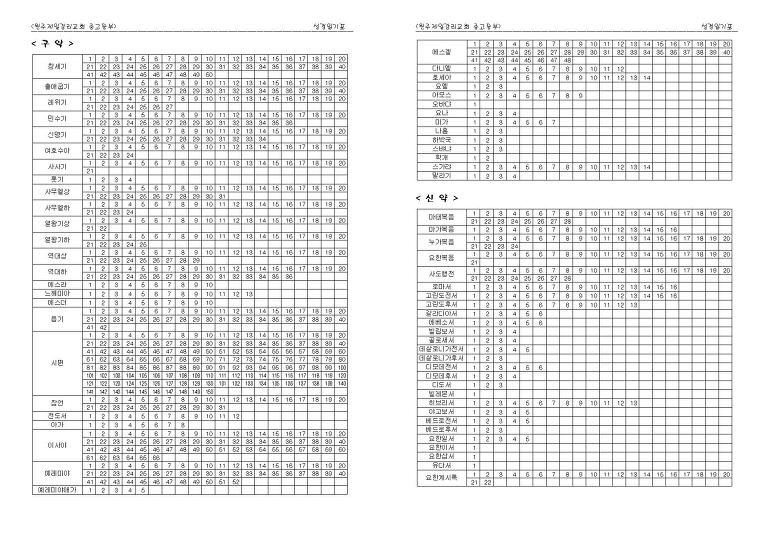 먼저 일반적인 성경읽기표입니다. 빈공간들이 있습니다. 몇 장을 읽었는지 세는데 조금 불편하지만 책별로 보기는 좋습니다.