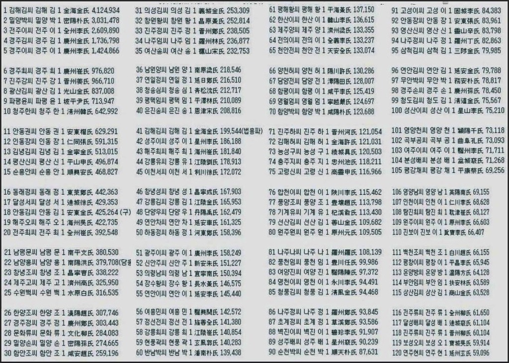 *001 가 (賈) -소주 가씨 *002 간 (簡) -가평 간씨 *003 갈 (葛) -남양 갈씨 *004 감 (甘) -회산 감씨