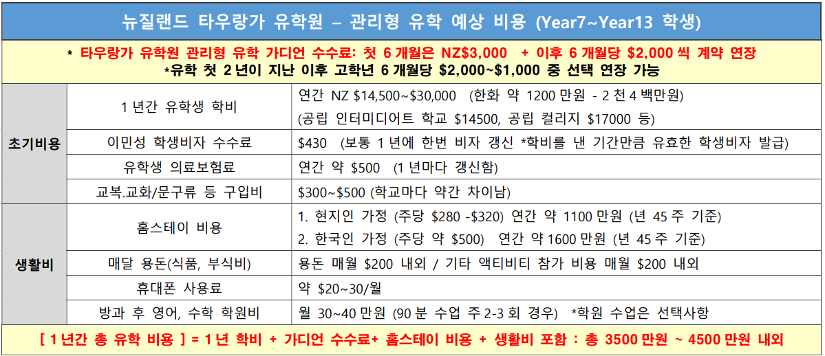 ▼ 아래 표는 제가 적극 추천하는 한국 홈스테이 또는 키위 홈스테이에서 생활하며 독립심을 키우는 가디언 관리형 유학을 뉴질랜드 타우랑가에서 할 때의 뉴질랜드 조기유학 비용입니다^^ 요즘 이 가디언 관리형 유학 시장이 급성장을 하고 있답니다^^