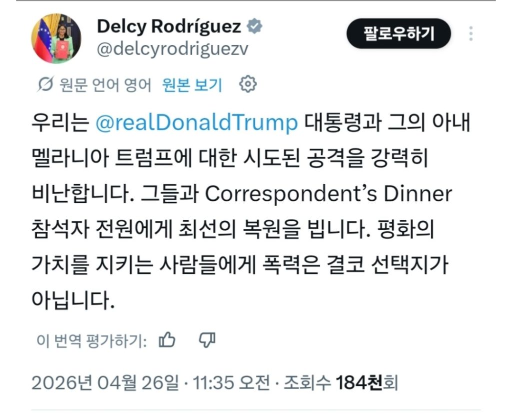 베네수엘라 근황 작성자차내금연|작성시간26.04.28|조회수34 목록 댓글 0 글자크기 작게가 글자크기 크게가 대통령 권한대행 로드리게스 부통령이트럼프 각하 내외분이 무사하셔서 다행이라면서1빠로 성명을 냄 ㅋㅋ1줄요약.마두로가 끌려가더니 베네수엘라가 착해짐. 다음검색 현재 게시글 추가 기능 열기 북마크 공유하기 신고 센터로 신고 댓글 댓글 0 댓글쓰기 답글쓰기 댓글 리스트