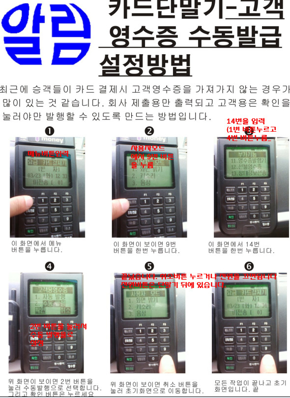 티머니 택시 카드 결제기 (단말기) 영수증 1장만 출력방법 작성자택시 불만제로|작성시간10.03.24|조회수1,296 목록 댓글 3 글자크기 작게가 글자크기 크게가 쉽습니다. 다음검색 현재 게시글 추가 기능 열기 북마크 공유하기 신고 센터로 신고 댓글 댓글 3 댓글쓰기 답글쓰기 댓글 리스트 작성자다윗 | 작성시간 10.03.25 손님이 영수증 원할때는 2장 뽑을순 있나요? 답댓글 작성자택시 불만제로 작성자 본인 여부 작성자 | 작성시간 10.03.25 한번해보시면 압니다. 당연히 2장나옵니다. 영수증나올때 화면에 질문이 나옵니다.손님용 영수증 뽑으실래요? 요렇게 기계가 묻습니다.ㅎㅎㅎ 작성자헤이쥬드 | 작성시간 10.04.09 불만제로님 ! 좋은 정보 감사합니다. 영수증 용지 절약되겠네요. ^^* 댓글 전체보기