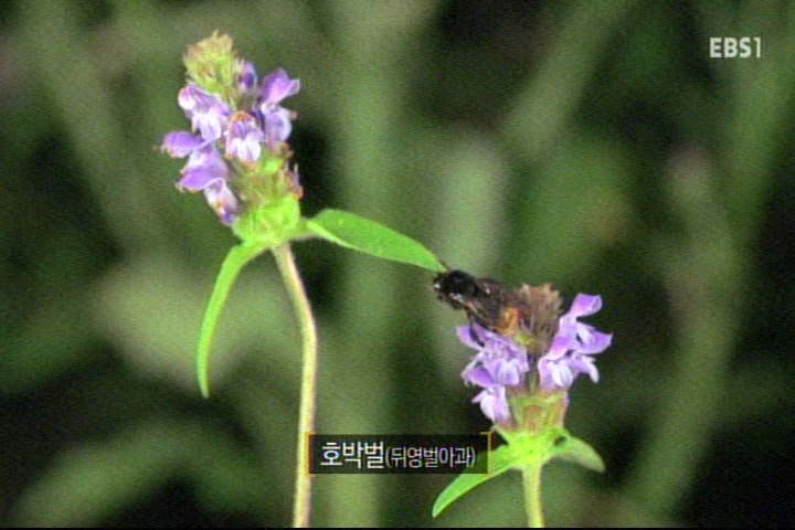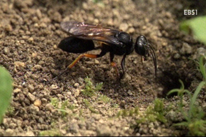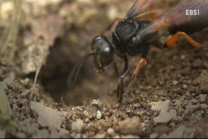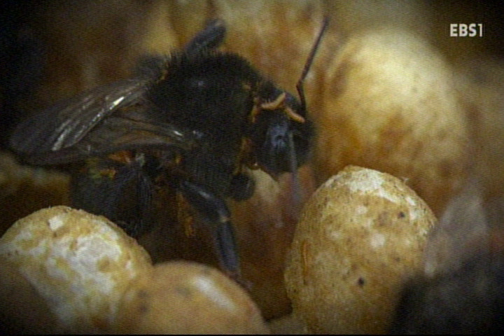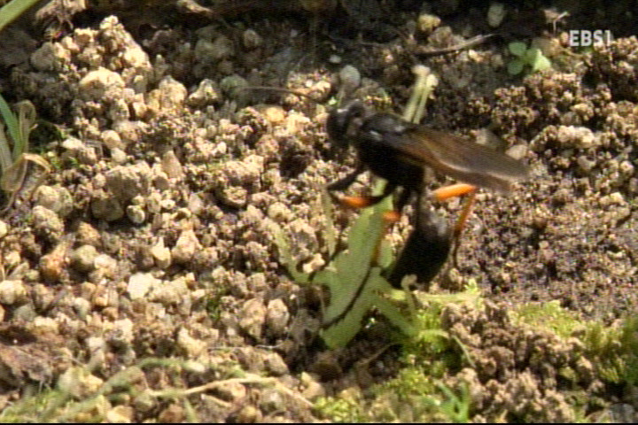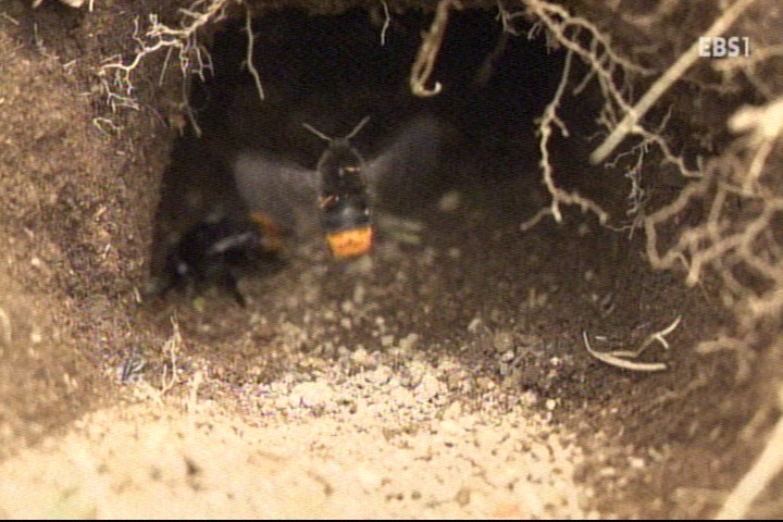 남가뢰애벌레를 몸에 붙이고 은식처(땅밑)를 향하는 호박벌 ...