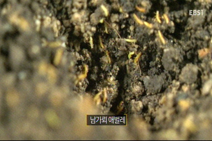 살아남은 남가뢰애벌레가 호박벌 애벌레 집 내부로 침투하여 ...