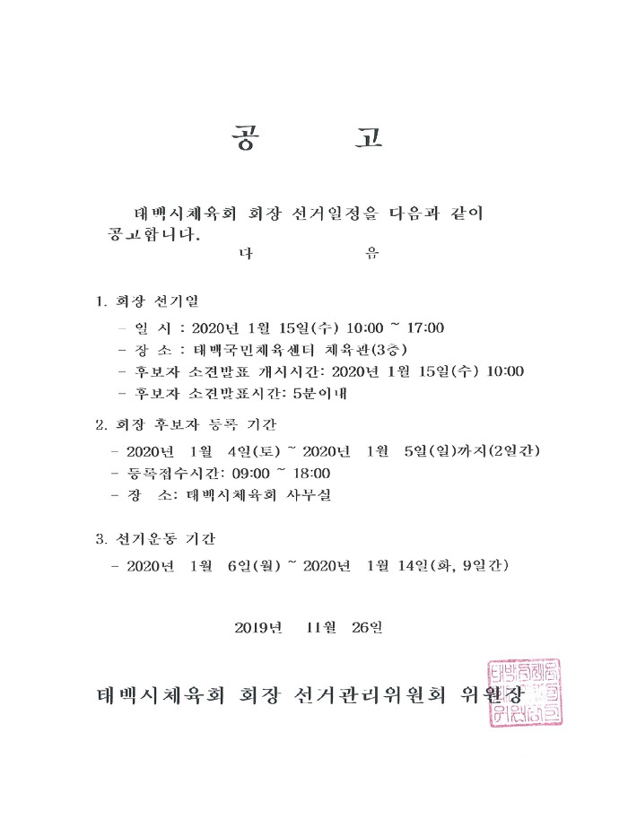 태백시체육회장 선거일정 공고 작성자박진희|작성시간19.11.26|조회수110 목록 댓글 0 글자크기 작게가 글자크기 크게가 선거일정공고.jpg 첨부파일첨부된 파일이 2개 있습니다. jpg 파일 선거일정공고.jpg 다운로드 jpg 파일 선거일정공고.jpg 다운로드 다음검색 현재 게시글 추가 기능 열기 북마크 공유하기 신고 센터로 신고 댓글 댓글 0 댓글쓰기 답글쓰기 댓글 리스트