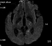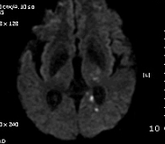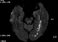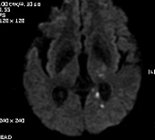 B MRI 촬영 결과는 좌측의 corona radiata, Lt temporo-occipital lobe 의 subcortical area 의 optic radiation 부위를 비롯한 여러 군데 점상 병변. N/S 정주하고 Aspirin 투여 시작, 혈압약은 지속 투여, SBP 160정도로 유지.