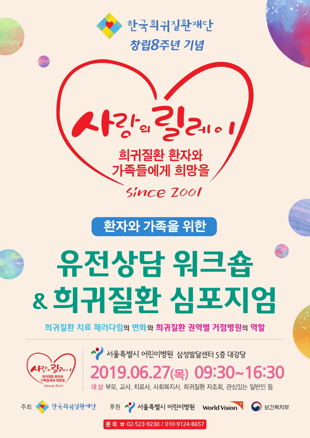 한국희귀질환재단 출범8주년을 기념하여, 희귀질환 환자와 가족들, 후원인, 시민 그리고 관련의료, 교육, 정책전문가 및 언론 관계자들을 모시고, 환자와 가족을 위한 「유전상담 워크숍」 과 「희귀질환 치료 패러다임 변화」 와 「희귀질환 권역별 거점 병원의 역할」 을 주제로 하는 「희귀질환 심포지움」에 많은 관심과 참여 부탁드립니다.